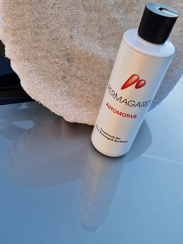 In this example, the bonnet of a car with 5,000 km, was cleaned with water and gummed with clay. See for yourself the colour of the cotton pad despite the two previous steps, we can say that PERMAGARD is a pigment developer, and this polish is also protective, resulting in :
